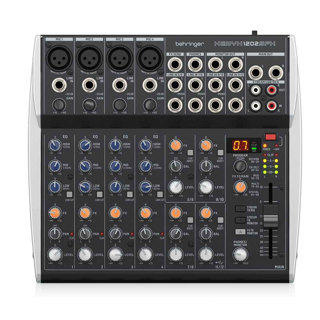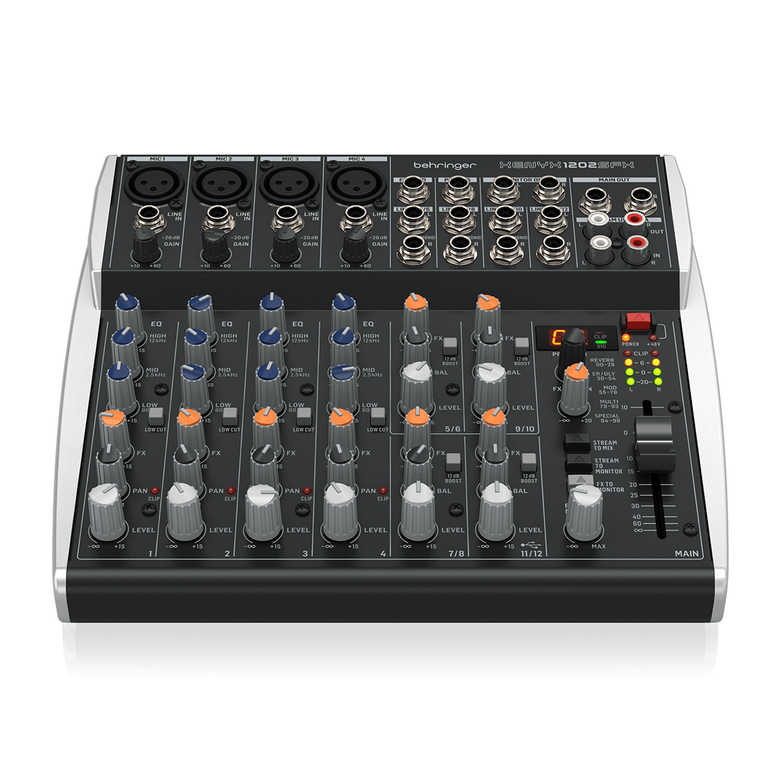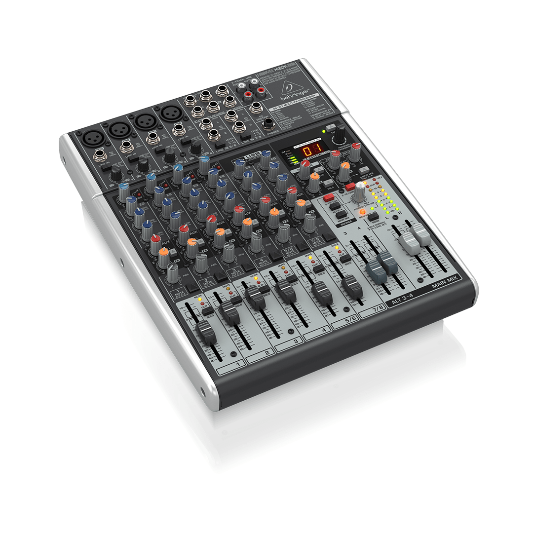 La Behringer Xenyx 1202FX USB est une table de mixage compacte à 12 canaux, idéale pour les petites configurations de sonorisation, les home studios ou les podcasts. Elle intègre une interface audio USB, des effets numériques 24 bits, et 4 préamplis micro Xenyx offrant un son clair et précis.