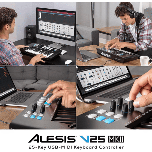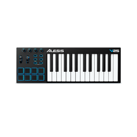 Le V25 de Alesis est un contrôleur MIDI puissant et intuitif qui vous permet de contrôler les logiciels musicaux sur votre ordinateur sans vous priver de la possibilité d’avoir un jeu dynamique.
