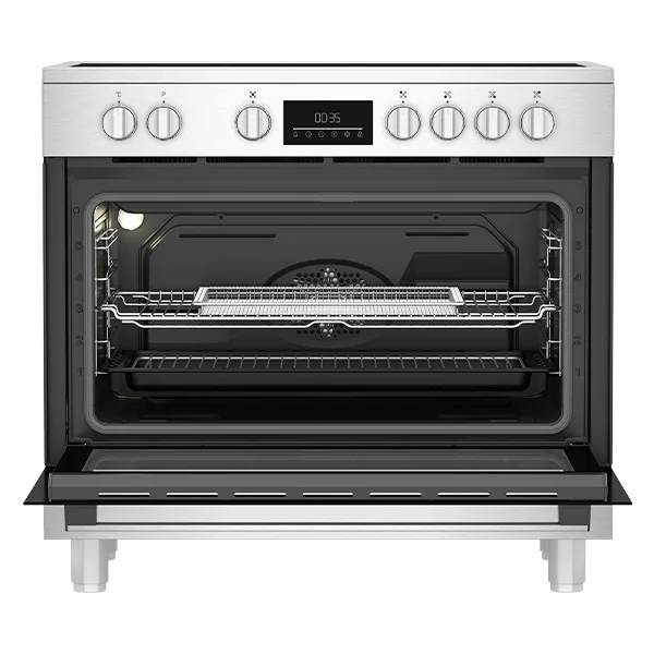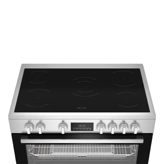 Cuisinière Beko 90 cm vitrocéramique avec 5 zones et four multifonction grande capacité, idéale pour une cuisine moderne et performante.
