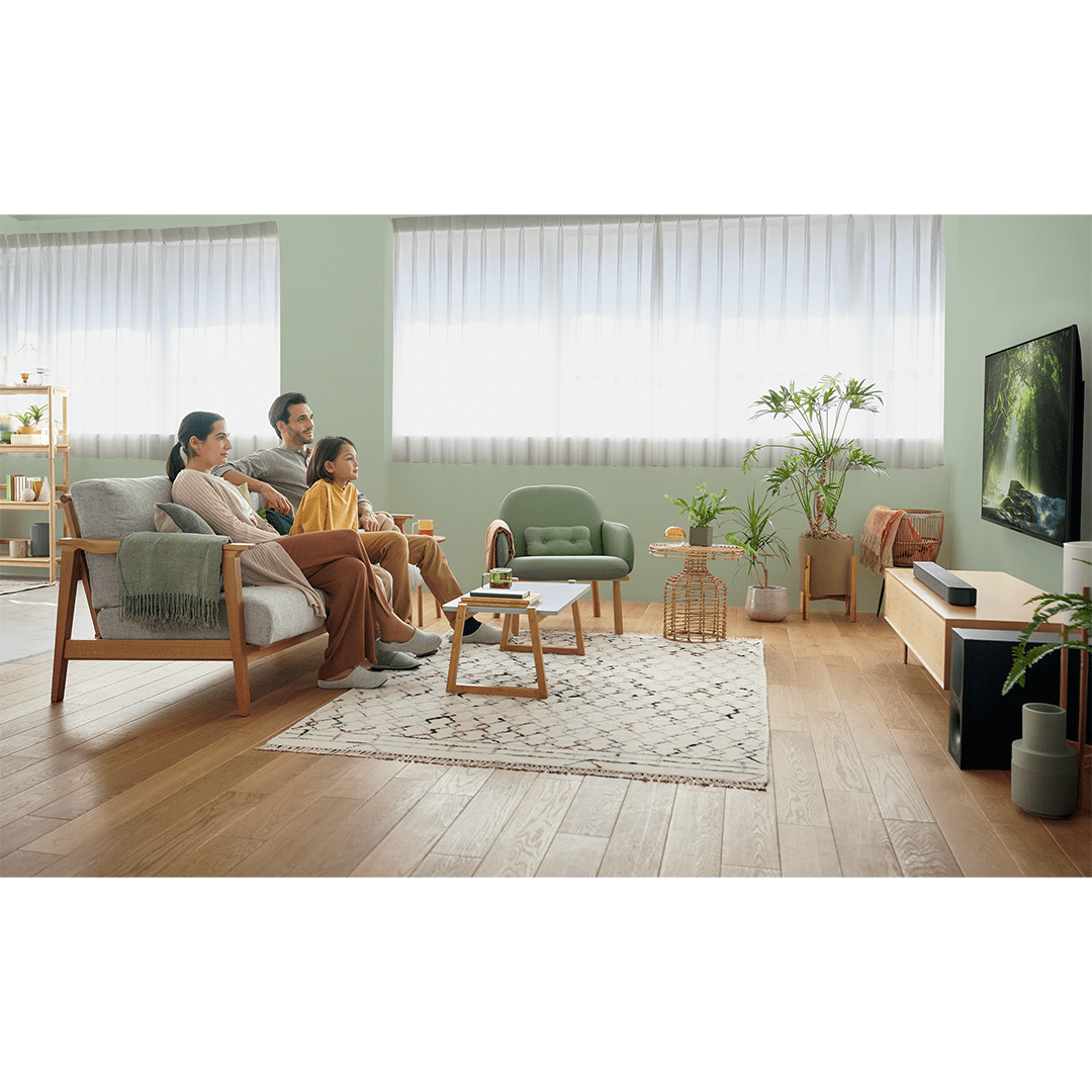 Design Élégant et Moderne : Son design épuré et sophistiqué s’intègre parfaitement à tout intérieur. La barre de son se marie harmonieusement avec votre téléviseur, apportant une touche de classe et de modernité à votre espace de divertissement.