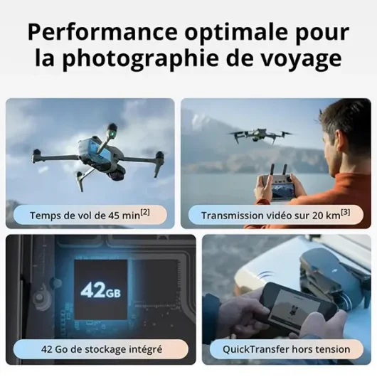 Le drone offre jusqu’à 45 minutes de vol sur une seule charge, ce qui en fait un compagnon fiable pour de longs plans aériens. Tom’s Guide+2DJI Official+2 Il dispose aussi de 42 Go de stockage interne pour sauvegarder vos vidéos sans dépendre uniquement d’une carte microSD.