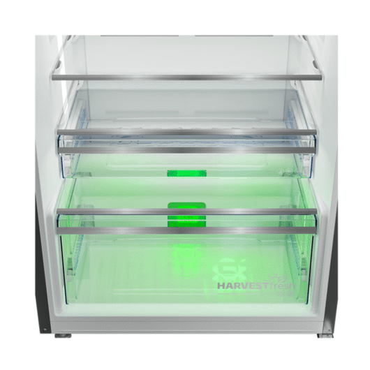 Le design élégant en inox s’intègre parfaitement dans toutes les cuisines modernes, et grâce à son éclairage LED, vous pourrez facilement accéder à vos produits, même dans l’obscurité. Ce modèle est aussi équipé d’un compartiment à légumes avec contrôle d’humidité, préservant ainsi vos fruits et légumes plus longtemps.