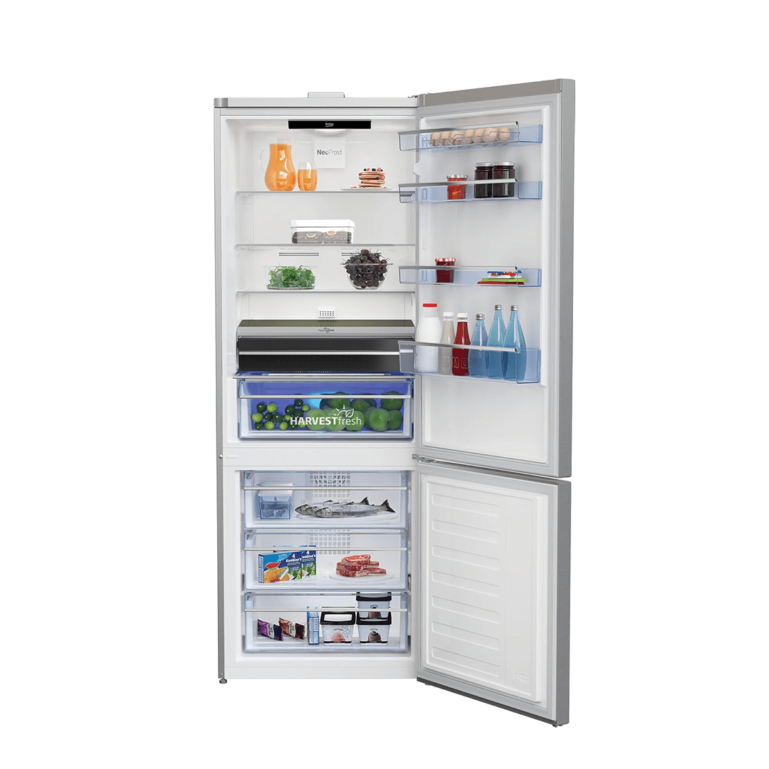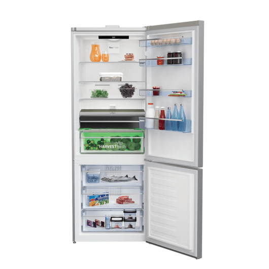 Le Réfrigérateur Combiné Beko RCNE560E40ZLXP de 560L en finition Bronze Premium offre une technologie Nofrost et trois tiroirs pour une conservation optimale de vos aliments.